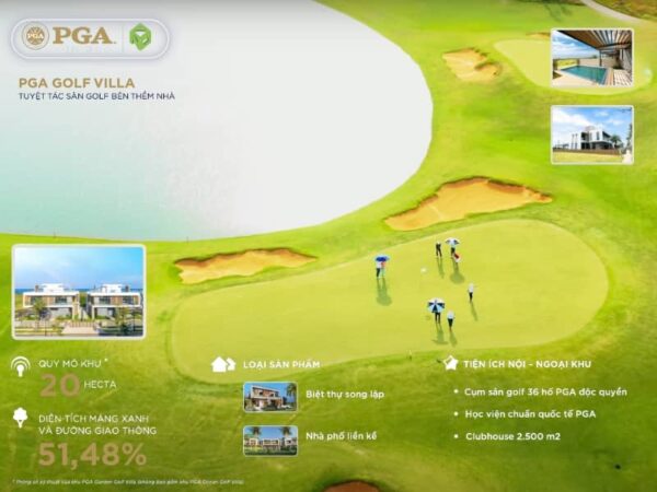 Phân khu PGA Golf Villas cung cấp hơn 770 căn biệt thự với diện tích đa dạng từ 7×30m đến 15×25m, đều có tầm nhìn triệu đô ra sân golf 36 lỗ đẹp như tranh vẽ. Một số căn biệt thự còn có view công viên thoáng đãng, mang lại cảm giác mát mẻ và dễ chịu. Các căn biệt thự được thiết kế độc đáo và tinh xảo, phù hợp với phong cách sống quý tộc và thượng lưu của cư dân. Đây là nơi lý tưởng để cư dân và gia đình nghỉ ngơi và tận hưởng cuộc sống.